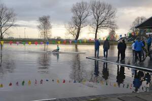 Op woensdag 30 december ‘s morgens om 11.00 uur was het ongebruikelijk druk op het vlot van de roeivereniging. Zoals vrijwel iedere dag zou Peter Florijn aankomen na zijn dagelijkse tocht van ruim 20 km, in de skiff.
